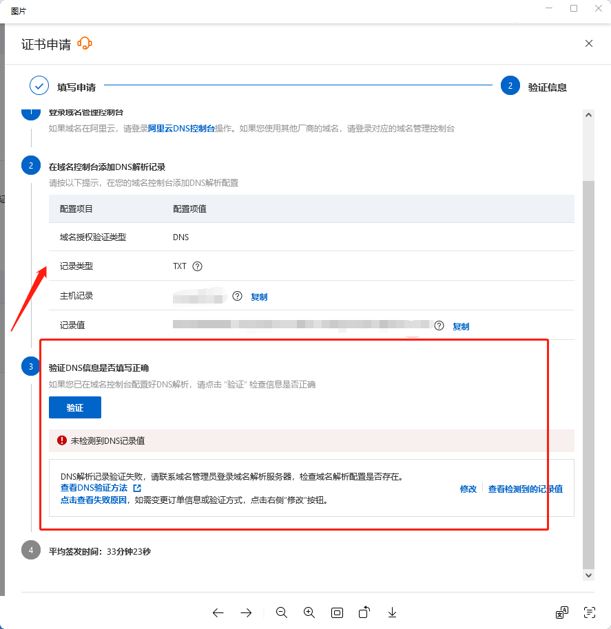 4.下一步-验证-提交审核。(如果你申请证书的域名不在该账号,你需要在域名的管理里,添加一条特定的 DNS 记录,按照以下信息添加)