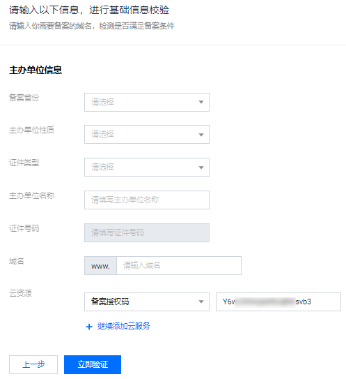 使用 Serverless 服务、负载均衡服务或输入当前账号被授予的备案授权码。