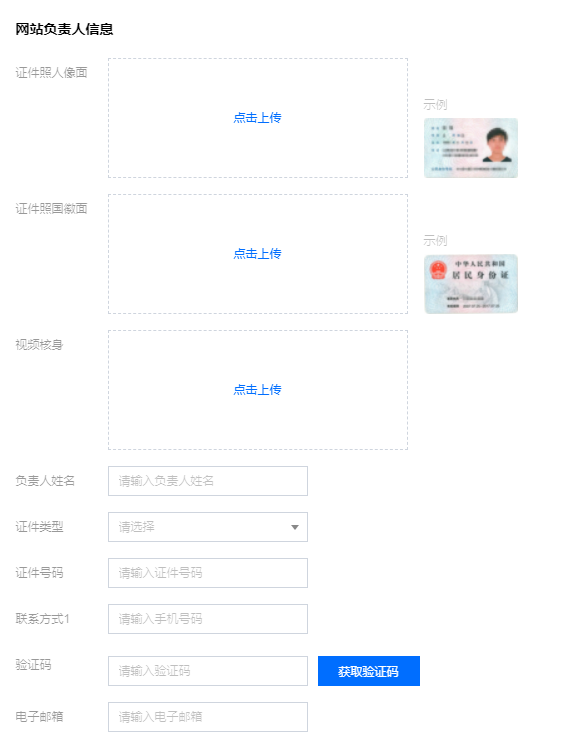 2.在 “网站负责人” 模块,上传相关材料以及填写相关信息。如下图所示: